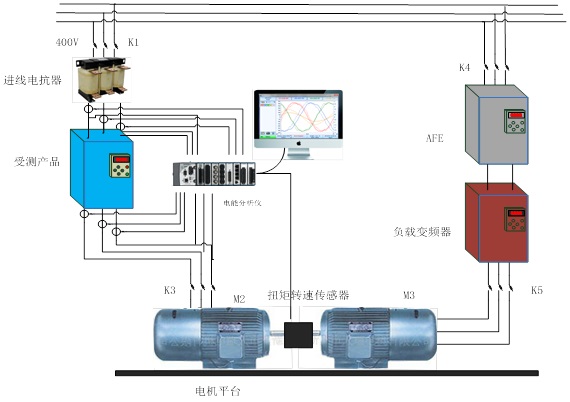 我公司开发的变频器满载测试系统采用国外进口AFE有源前端单元,将负载产生的能量反馈给电网,实现对变频器进行满功率,满转矩加载,采用高性能数据采集卡DAQ对变频器的输入电压,电流,输出电压电流,转矩,转速,温度进行实时检测,相比于传统的,励磁电机,直流电机负载,具有能耗低,加载功率大,长时间加载,维护简单等特点。